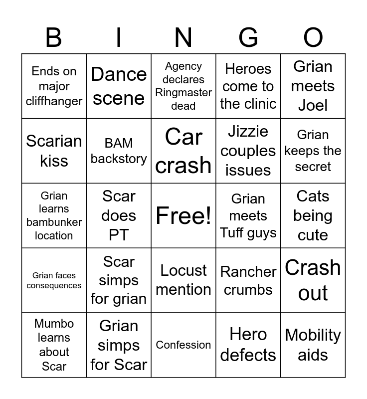 This bingo card has a free space and 24 words: Scar simps for grian, Grian simps for Scar, Car crash, Mumbo learns about Scar, Grian meets Joel, Ends on major cliffhanger, Scarian kiss, Dance scene, Grian meets Tuff guys, Locust mention, Jizzie couples issues, Grian learns bambunker location, Rancher crumbs, Crash out, BAM backstory, Hero defects, Cats being cute, Agency declares Ringmaster dead, Grian keeps the secret, Scar does PT, Mobility aids, Grian faces consequences, Heroes come to the clinic and Confession.