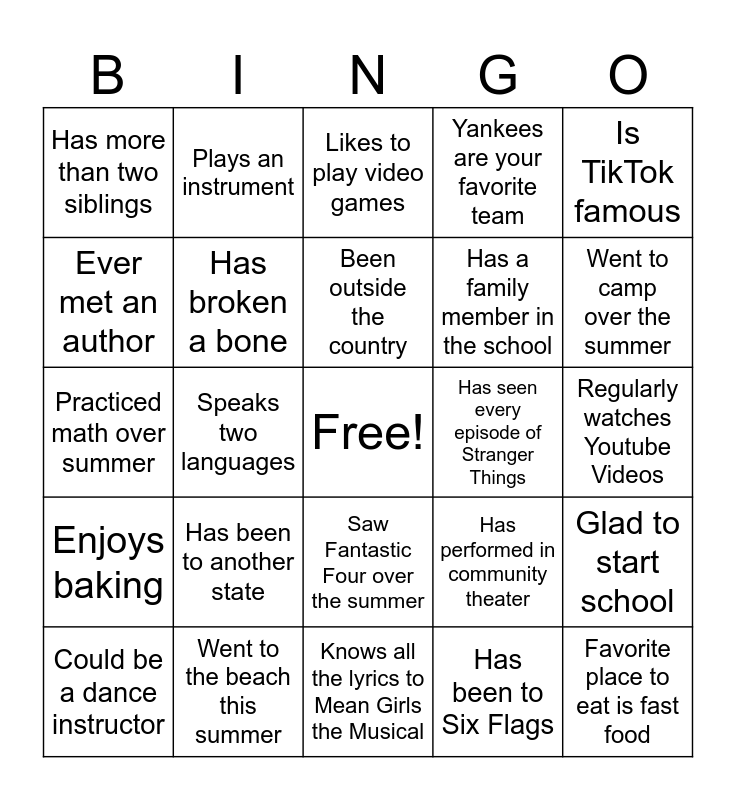 This bingo card has a free space and 29 words: Could be a dance instructor, Likes to read, Speaks two languages, Reads books about sports, Has more than two siblings, Likes to play video games, Has broken a bone, Has been to another state, Has seen every episode of Stranger Things, Went to the beach this summer, Regularly watches Youtube Videos, Favorite place to eat is fast food, Knows all the lyrics to Mean Girls the Musical, Has been to Six Flags, Went to camp over the summer, Favorite subject is Math, Saw Fantastic Four over the summer, Enjoys baking, Is TikTok famous, Practiced math over summer, Has performed in community theater, Prefers dogs over cats, Has a family member in the school, Ever met an author, Yankees are your favorite team, Plays an instrument, Glad to start school, Been outside the country and Like to play sports.