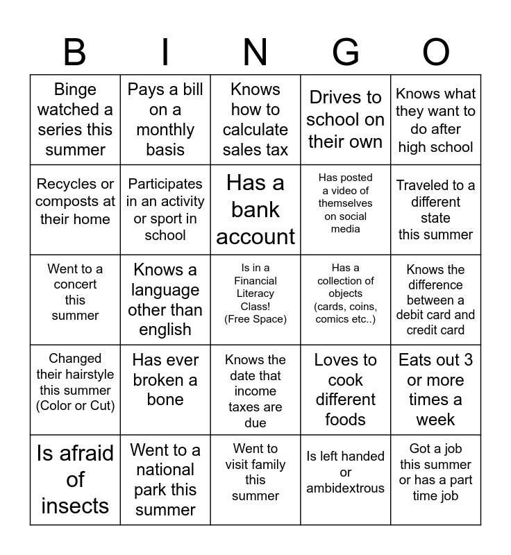 This bingo card has a free space and 29 words: Is afraid of insects, Got a new pet or has a pet, Knows a language other than english, Has traveled to a different country, Binge watched a series this summer, Knows how to calculate sales tax, Participates in an activity or sport in school, Has ever broken a bone, Has a collection of objects (cards, coins, comics etc..), Went to a national park this summer, Knows the difference between a debit card and credit card, Got a job this summer or has a part time job, Went to visit family this summer, Is left handed or ambidextrous, Traveled to a different state this summer, Has lived in a different state than Colorado, Knows the date that income taxes are due, Changed their hairstyle this summer (Color or Cut), Knows what they want to do after high school, Went to a concert this summer, Loves to cook different foods, Has a sibling in the school, Has posted a video of themselves on social media, Recycles or composts at their home, Drives to school on their own, Pays a bill on a monthly basis, Eats out 3 or more times a week, Has a bank account and Has saved money or is saving to make a big purchase.