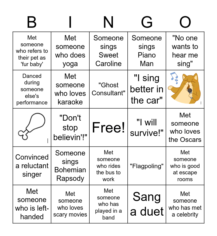 This bingo card has 2 images, a free space and 22 words: Someone sings Bohemian Rapsody, Met someone who loves scary movies, "Ghost Consultant", Met someone who is left-handed, "No one wants to hear me sing", Met someone who refers to their pet as 'fur baby', Danced during someone else's performance, Met someone who does yoga, "I will survive!", Met someone who rides the bus to work, "I sing better in the car", "Flagpoling", Met someone who is good at escape rooms, Met someone who loves karaoke, Sang a duet, Met someone who loves the Oscars, Someone sings Sweet Caroline, "Don't stop believin'!", Met someone who has met a celebrity, Convinced a reluctant singer, Someone sings Piano Man and Met someone who has played in a band.