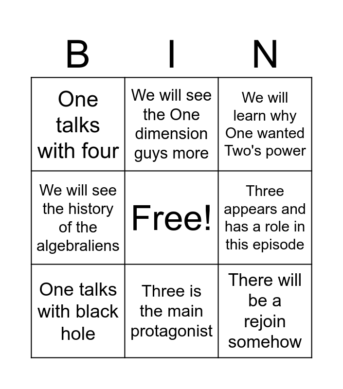This bingo card has a free space and 8 words: Three appears and has a role in this episode, We will learn why One wanted Two's power, We will see the One dimension guys more, One talks with black hole, One talks with four, There will be a rejoin somehow, We will see the history of the algebraliens and Three is the main protagonist.