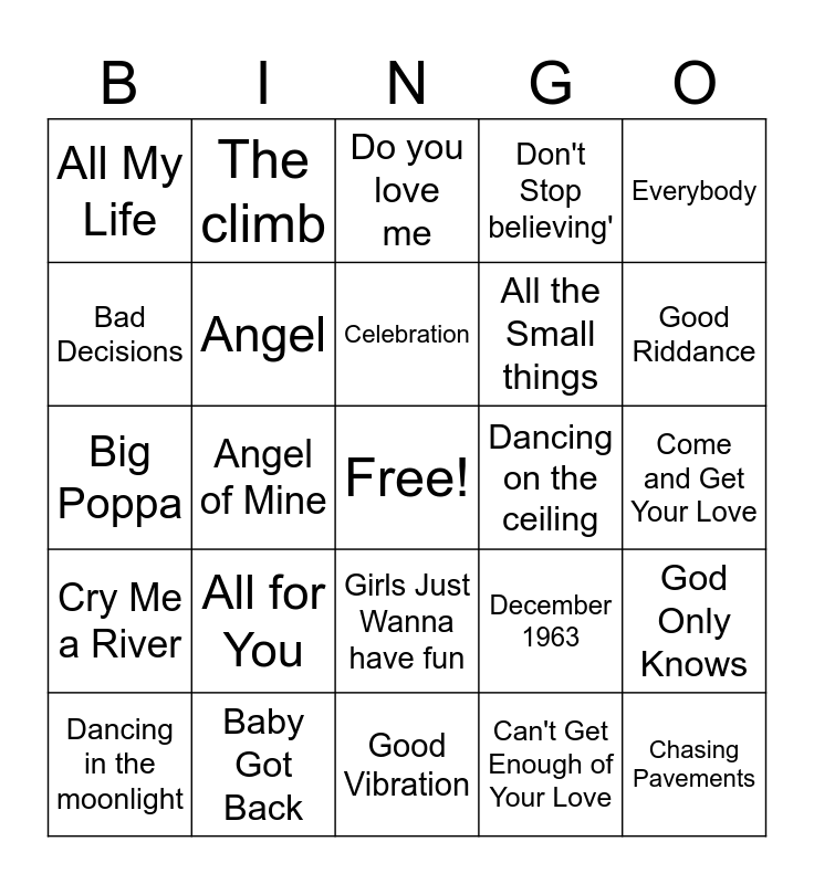 This bingo card has a free space and 24 words: All for You, Baby Got Back, Celebration, Dancing in the moonlight, Everybody, All My Life, Bad Decisions, The climb, Dancing on the ceiling, Girls Just Wanna have fun, All the Small things, Big Poppa, December 1963, God Only Knows, Angel, Can't Get Enough of Your Love, Come and Get Your Love, Do you love me, Good Riddance, Angel of Mine, Chasing Pavements, Cry Me a River, Don't Stop believing' and Good Vibration.