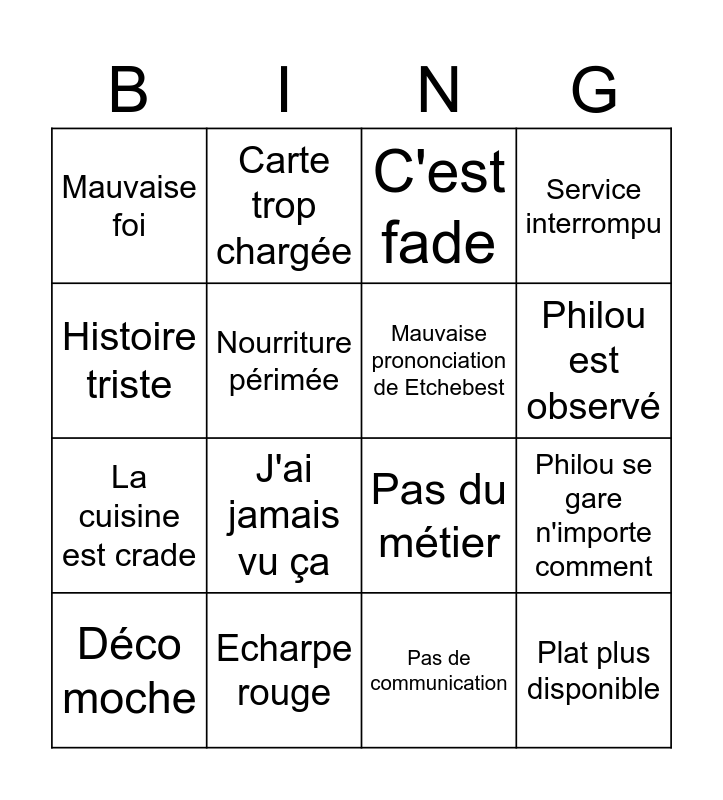 This bingo card has 16 words: Echarpe rouge, Philou se gare n'importe comment, C'est fade, Mauvaise foi, La cuisine est crade, Carte trop chargée, Pas du métier, Pas de communication, Histoire triste, Nourriture périmée, Déco moche, Service interrompu, J'ai jamais vu ça, Philou est observé, Mauvaise prononciation de Etchebest and Plat plus disponible.
