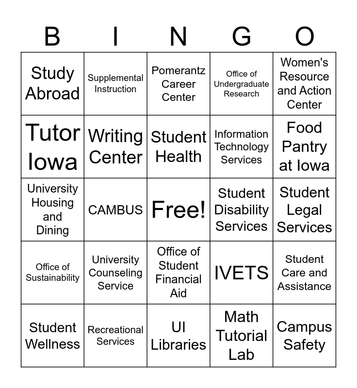 This bingo card has a free space and 24 words: University Counseling Service, Recreational Services, Student Health, Student Wellness, Women's Resource and Action Center, Study Abroad, Tutor Iowa, Supplemental Instruction, Student Disability Services, Office of Student Financial Aid, Information Technology Services, University Housing and Dining, IVETS, Student Care and Assistance, Writing Center, Math Tutorial Lab, Student Legal Services, Pomerantz Career Center, Food Pantry at Iowa, CAMBUS, Campus Safety, Office of Sustainability, Office of Undergraduate Research and UI Libraries.