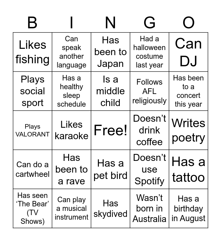 This bingo card has a free space and 24 words: Has been to a rave, Can play a musical instrument, Is a middle child, Has seen ‘The Bear’ (TV Shows), Can DJ, Likes fishing, Plays social sport, Can speak another language, Doesn’t drink coffee, Has a pet bird, Follows AFL religiously, Plays VALORANT, Doesn’t use Spotify, Has a tattoo, Has a healthy sleep schedule, Wasn’t born in Australia, Writes poetry, Has been to Japan, Has been to a concert this year, Likes karaoke, Has a birthday in August, Can do a cartwheel, Had a halloween costume last year and Has skydived.