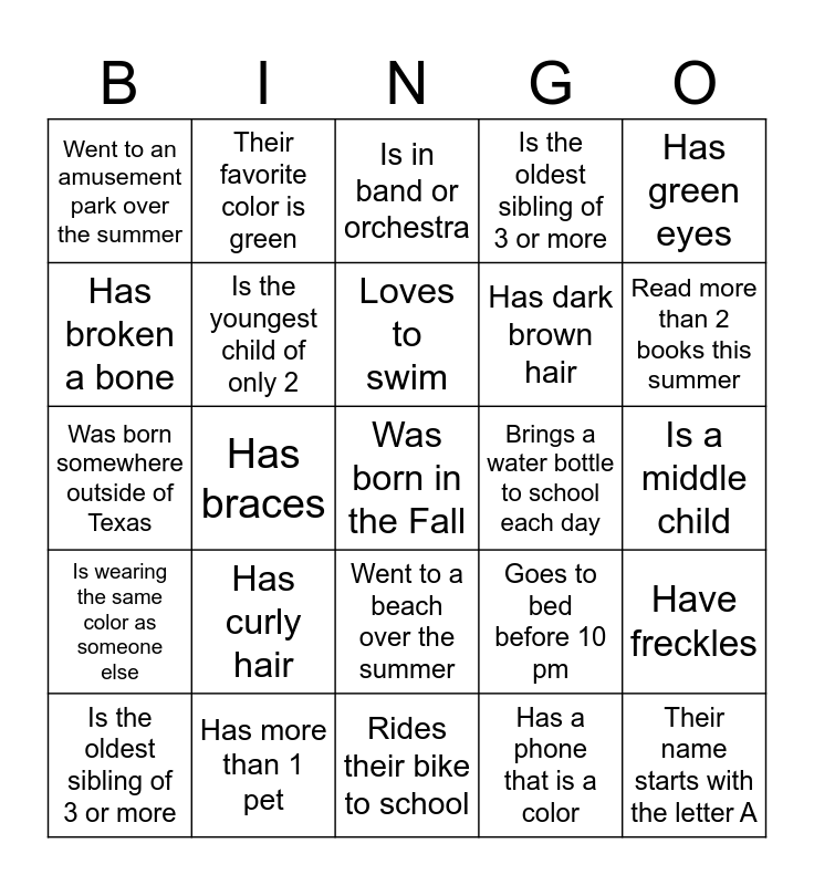This bingo card has a free space and 29 words: Is the oldest sibling of 3 or more, Their favorite color is green, Has braces, Loves to swim, Went to an amusement park over the summer, Is in band or orchestra, Is the youngest child of only 2, Has curly hair, Brings a water bottle to school each day, Has more than 1 pet, Is a middle child, Their name starts with the letter A, Rides their bike to school, Has a phone that is a color, Read more than 2 books this summer, Has any pet that's not a dog, Went to a beach over the summer, Is wearing the same color as someone else, Has green eyes, Was born somewhere outside of Texas, Goes to bed before 10 pm, Watched an entire TV series this summer, Has dark brown hair, Has broken a bone, Is the oldest sibling of 3 or more, Their favorite color is green, Have freckles, Loves to swim and Went to an amusement park over the summer.