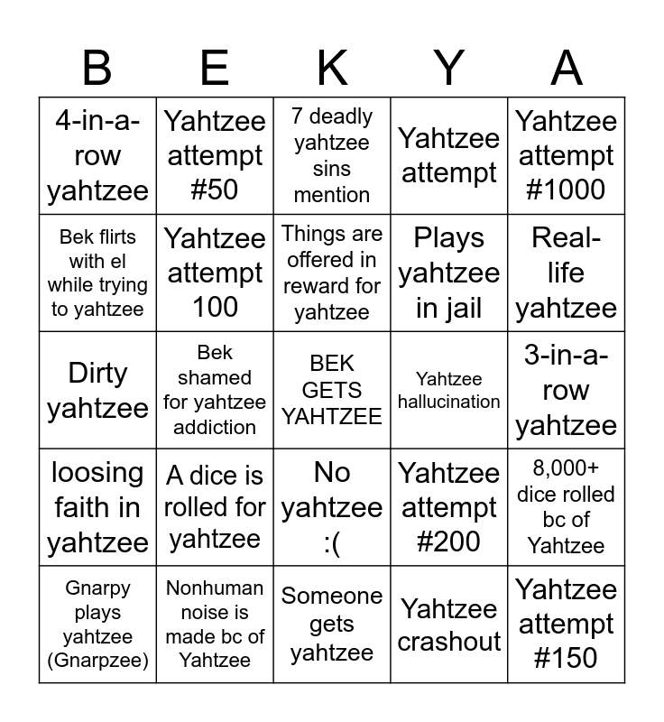 This bingo card has a free space and 24 words: A dice is rolled for yahtzee, Nonhuman noise is made bc of Yahtzee, Things are offered in reward for yahtzee, Gnarpy plays yahtzee (Gnarpzee), Yahtzee attempt #1000, 4-in-a-row yahtzee, Bek flirts with el while trying to yahtzee, Yahtzee attempt #50, Yahtzee hallucination, No yahtzee :(, Plays yahtzee in jail, Dirty yahtzee, Yahtzee attempt #200, 8,000+ dice rolled bc of Yahtzee, Yahtzee attempt 100, Yahtzee crashout, 3-in-a-row yahtzee, 7 deadly yahtzee sins mention, Real-life yahtzee, Bek shamed for yahtzee addiction, Yahtzee attempt #150, loosing faith in yahtzee, Yahtzee attempt and Someone gets yahtzee.