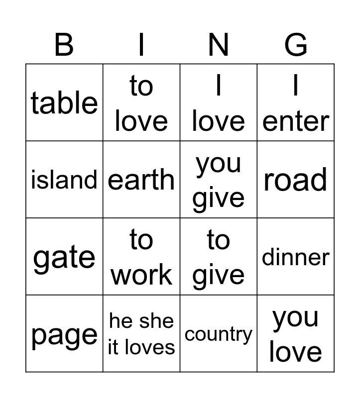 This bingo card has 28 words: water, story, gate, forest, earth, I love, to love, you love, he she it loves, I give, to give, I enter, to enter, I work, to work, I tell, to tell, you give, road, ditch, table, breeze, page, dinner, country, queen, island and turning point, goal.