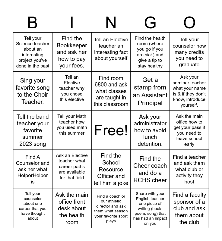 This bingo card has a free space and 29 words: Tell your counselor about one career that you have thought about, Share your favorite book or author with one of our librarians, Tell your Math teacher how you used math this summer, Tell your Social Studies teacher a historical event you find fascinating, Tell your Science teacher about an interesting project you've done in the past, Tell an Elective teacher an interesting fact about yourself, Tell an Elective teacher why you chose this elective, Ask an Elective teacher what career paths are available for that field, Ask your administrator how to avoid lunch detention., Ask the main office front desk about the health room, Ask the main office how to get your pass if you need to leave school early, Find a faculty sponsor of a club and ask them about the club, Find a coach or our athletic director and ask them what season your favorite sport plays, Share with your English teacher one piece of writing (book, poem, song) that has had an impact on you, Ask your seminar teacher what your name is & if they don't know, introduce yourself., Get the signature of Principal Abner, Find the School Resource Officer and tell him a joke, Find A Counselor and ask her what HelperHelper is, Tell your counselor how many credits you need to graduate, Tell the band teacher your favorite summer 2023 song, Find the Cheer coach and do a RCHS cheer, Ask a security officer what their name is and introduce yourself, Get a stamp from an Assistant Principal, Sing your favorite song to the Choir Teacher., Find the health room (where you go if you are sick) and give a tip to stay healthy, Find the Bookkeeper and ask her how to pay your fees., Find a teacher and ask them what club or activity they host, Find room 6800 and ask what classes are taught in this classroom and Find a counselor and tell them what your strongest Source of Strength is.