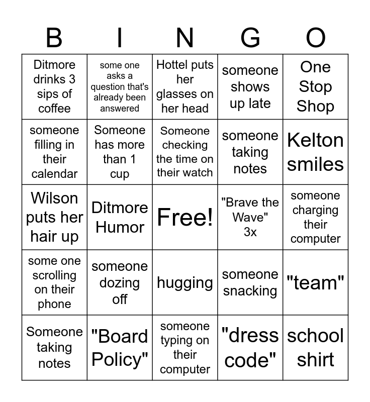 This bingo card has a free space and 39 words: "welcome back", I met someone new, Ditmore gives "her look", Someone has more than 1 cup, Someone taking notes, hugging, Someone checking the time on their watch, "Non-Negotiables", One Stop Shop, some one scrolling on their phone, Ditmore Humor, someone shows up late, school shirt, someone charging their computer, "Brave the Wave" 3x, someone dozing off, Wilson playing with her lanyard, Ditmore drinks 3 sips of coffee, Some one goes to the bathroom more than once, someone snacking, someone filling in their calendar, someone typing on their computer, someone taking notes, Kelton smiles, "expectations", "Duty", Teacher earrings, Wilson has an energy drink, someone has a collection of pens, some one asks a question that's already been answered, Some one fanning themselves, some one puts on a coat or cardigan, Hottel puts her glasses on her head, "Board Policy", "dress code", "expectations", "team", Wilson puts her hair up and Tick (tapping, biting nails, bouncing).