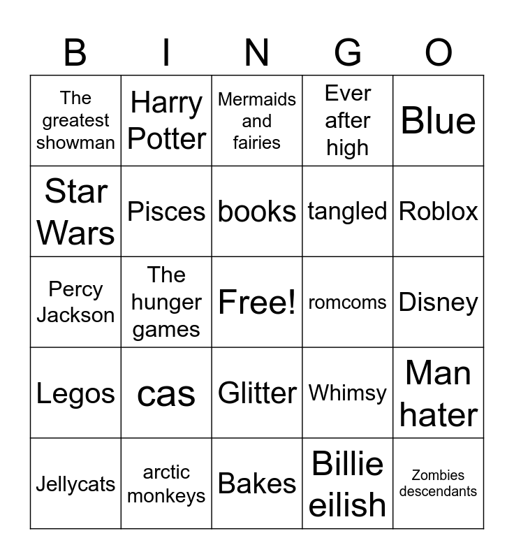 This bingo card has a free space and 24 words: cas, arctic monkeys, books, Jellycats, Blue, The greatest showman, Star Wars, Harry Potter, romcoms, Glitter, tangled, Percy Jackson, Whimsy, Man hater, Pisces, Billie eilish, Disney, Mermaids and fairies, Roblox, The hunger games, Zombies descendants, Legos, Ever after high and Bakes.