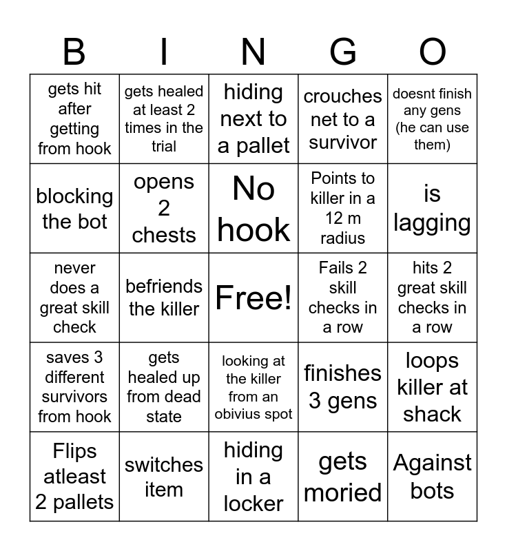 This bingo card has a free space and 24 words: Flips atleast 2 pallets, gets healed up from dead state, No hook, gets moried, doesnt finish any gens (he can use them), gets hit after getting from hook, gets healed at least 2 times in the trial, hiding next to a pallet, Fails 2 skill checks in a row, hits 2 great skill checks in a row, never does a great skill check, opens 2 chests, finishes 3 gens, loops killer at shack, blocking the bot, switches item, hiding in a locker, crouches net to a survivor, is lagging, saves 3 different survivors from hook, befriends the killer, looking at the killer from an obivius spot, Points to killer in a 12 m radius and Against bots.