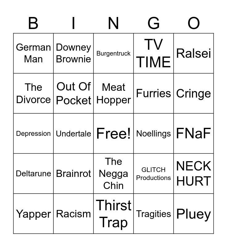 This bingo card has a free space and 24 words: Brainrot, Racism, Meat Hopper, Yapper, Ralsei, German Man, The Divorce, Downey Brownie, Noellings, The Negga Chin, Furries, Depression, GLITCH Productions, NECK HURT, Out Of Pocket, Tragities, FNaF, Burgentruck, Cringe, Undertale, Pluey, Deltarune, TV TIME and Thirst Trap.