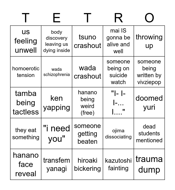This bingo card has a free space and 24 words: "i need you", transfem yanagi, wada crashout, hanano face reveal, throwing up, us feeling unwell, homoerotic tension, body discovery leaving us dying inside, "I- I- I-... I....", someone getting beaten, someone being on suicide watch, tamba being tactless, ojima dissociating, dead students mentioned, wada schizophrenia, kazutoshi fainting, doomed yuri, tsuno crashout, someone being written by vivziepop, ken yapping, trauma dump, they eat something, mai IS gonna be alive and well and hiroaki bickering.