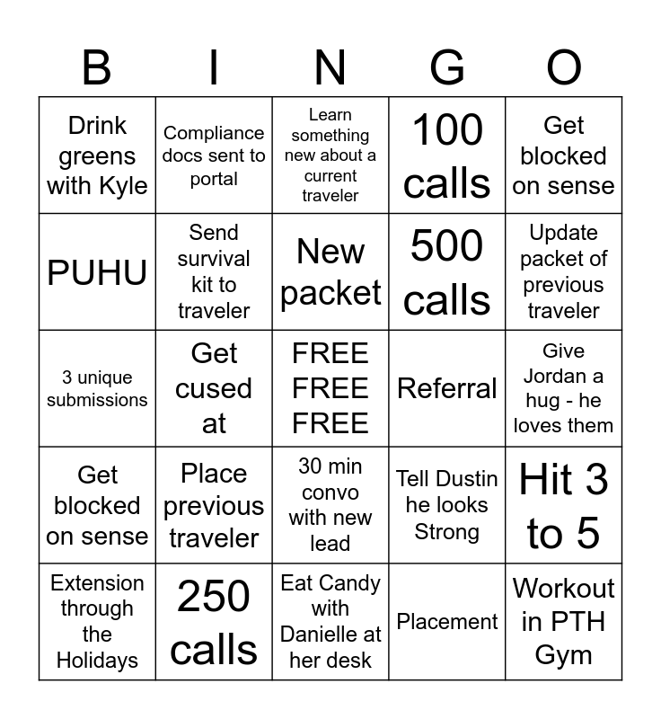 This bingo card has a free space and 24 words: Place previous traveler, 250 calls, New packet, Extension through the Holidays, Get blocked on sense, Drink greens with Kyle, PUHU, Compliance docs sent to portal, Referral, 30 min convo with new lead, 500 calls, 3 unique submissions, Tell Dustin he looks Strong, Hit 3 to 5, Send survival kit to traveler, Placement, Give Jordan a hug - he loves them, Learn something new about a current traveler, Update packet of previous traveler, Get cused at, Workout in PTH Gym, Get blocked on sense, 100 calls and Eat Candy with Danielle at her desk.