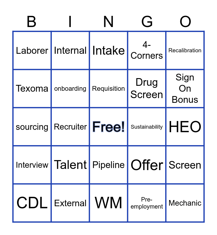 This bingo card has a free space and 24 words: Talent, External, Requisition, CDL, Recalibration, Laborer, Texoma, Internal, Sustainability, Pipeline, Drug Screen, sourcing, Offer, Screen, onboarding, Pre-employment, HEO, Intake, Sign On Bonus, Recruiter, Mechanic, Interview, 4-Corners and WM.