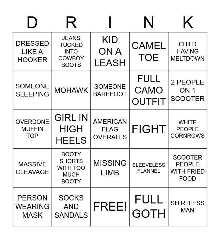 This bingo card has a free space and 24 words: BOOTY SHORTS WITH TOO MUCH BOOTY, SOCKS AND SANDALS, SOMEONE BAREFOOT, PERSON WEARING MASK, CHILD HAVING MELTDOWN, DRESSED LIKE A HOOKER, SOMEONE SLEEPING, JEANS TUCKED INTO COWBOY BOOTS, FIGHT, MISSING LIMB, FULL CAMO OUTFIT, OVERDONE MUFFIN TOP, SLEEVELESS FLANNEL, SCOOTER PEOPLE WITH FRIED FOOD, MOHAWK, FULL GOTH, WHITE PEOPLE CORNROWS, KID ON A LEASH, 2 PEOPLE ON 1 SCOOTER, GIRL IN HIGH HEELS, SHIRTLESS MAN, MASSIVE CLEAVAGE, CAMEL TOE and FREE!.
