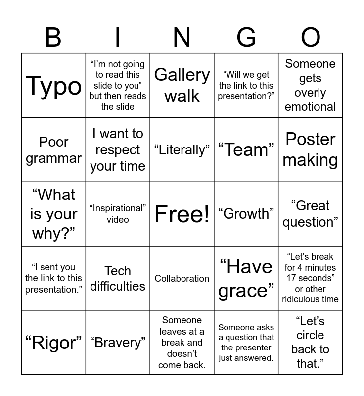 This bingo card has a free space and 24 words: Tech difficulties, “Bravery”, “Literally”, “Rigor”, Someone gets overly emotional, Typo, Poor grammar, “I’m not going to read this slide to you” but then reads the slide, “Growth”, Collaboration, “Team”, “What is your why?”, “Have grace”, “Let’s break for 4 minutes 17 seconds” or other ridiculous time, I want to respect your time, Someone asks a question that the presenter just answered., “Great question”, Gallery walk, Poster making, “Inspirational” video, “Let’s circle back to that.”, “I sent you the link to this presentation.”, “Will we get the link to this presentation?” and Someone leaves at a break and doesn’t come back..