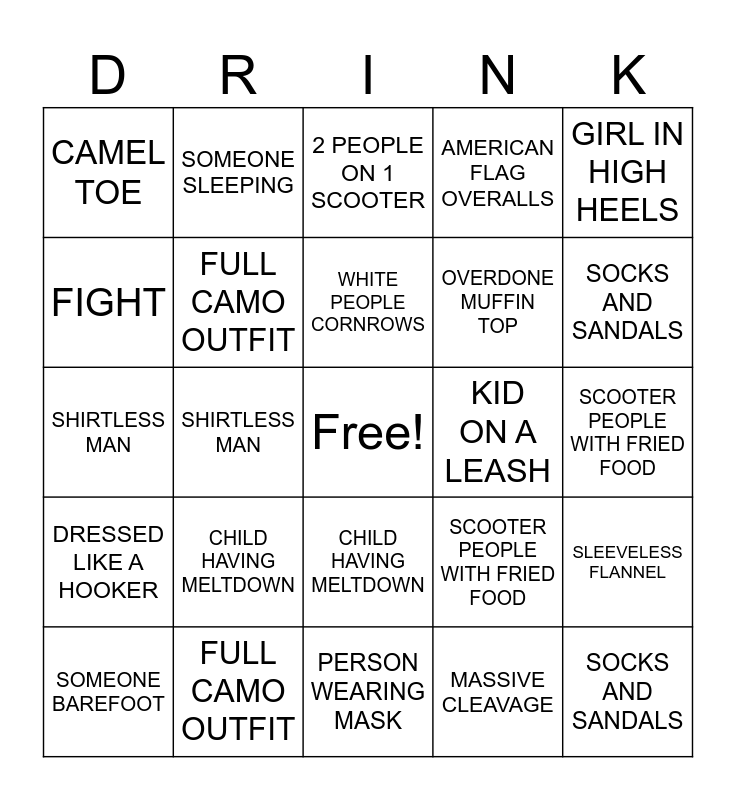 This bingo card has a free space and 48 words: BOOTY SHORTS WITH TOO MUCH BOOTY, SOCKS AND SANDALS, SOMEONE BAREFOOT, PERSON WEARING MASK, CHILD HAVING MELTDOWN, DRESSED LIKE A HOOKER, SOMEONE SLEEPING, JEANS TUCKED INTO COWBOY BOOTS, FIGHT, MISSING LIMB, FULL CAMO OUTFIT, AMERICAN FLAG OVERALLS, SLEEVELESS FLANNEL, SCOOTER PEOPLE WITH FRIED FOOD, MOHAWK, FULL GOTH, WHITE PEOPLE CORNROWS, KID ON A LEASH, 2 PEOPLE ON 1 SCOOTER, GIRL IN HIGH HEELS, SHIRTLESS MAN, MASSIVE CLEAVAGE, CAMEL TOE, OVERDONE MUFFIN TOP, BOOTY SHORTS WITH TOO MUCH BOOTY, SOCKS AND SANDALS, SOMEONE BAREFOOT, PERSON WEARING MASK, CHILD HAVING MELTDOWN, DRESSED LIKE A HOOKER, SOMEONE SLEEPING, JEANS TUCKED INTO COWBOY BOOTS, FIGHT, MISSING LIMB, FULL CAMO OUTFIT, AMERICAN FLAG OVERALLS, SLEEVELESS FLANNEL, SCOOTER PEOPLE WITH FRIED FOOD, MOHAWK, FULL GOTH, WHITE PEOPLE CORNROWS, KID ON A LEASH, 2 PEOPLE ON 1 SCOOTER, GIRL IN HIGH HEELS, SHIRTLESS MAN, MASSIVE CLEAVAGE, CAMEL TOE and OVERDONE MUFFIN TOP.