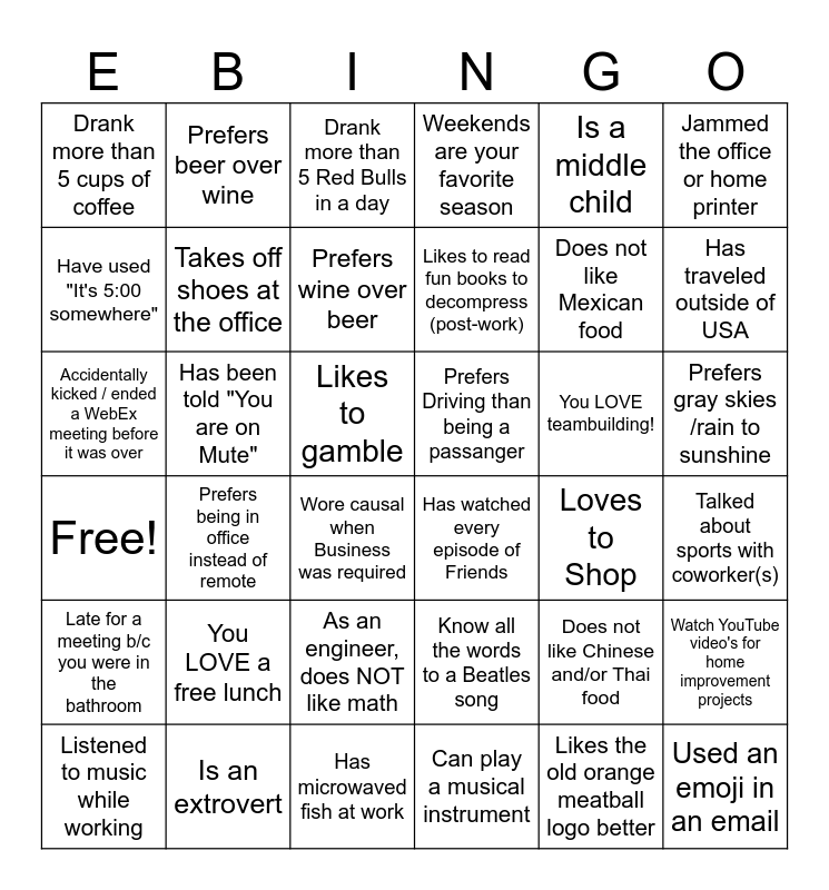 This bingo card has 42 words: Likes the old orange meatball logo better, Takes off shoes at the office, Announced someone got a haircut, You LOVE teambuilding!, Talked about sports with coworker(s), Prefers being in office instead of remote, Accidentally kicked / ended a WebEx meeting before it was over, Is an introvert, Drank more than 5 Red Bulls in a day, Prefers gray skies /rain to sunshine, Likes to gamble, Likes to read fun books to decompress (post-work), Has traveled outside of USA, Is a middle child, Is an extrovert, Free!, Watch YouTube video's for home improvement projects, Does not like Mexican food, Used an emoji in an email, Prefers beer over wine, Jammed the office or home printer, As an engineer, does NOT like math, Late for a meeting b/c you were in the bathroom, Drank more than 5 cups of coffee, Prefers exercising over reading, Listened to music while working, Prefers wine over beer, Is not a Lord of Rings fan, You LOVE a free lunch, Does not like Chinese and/or Thai food, Prefers reading over exercising, Prefers Driving than being a passanger, Have used "It's 5:00 somewhere", Loves to Shop, Has microwaved fish at work, Wore causal when Business was required, Has watched every episode of Friends, Has been told "You are on Mute", Know all the words to a Beatles song, Can play a musical instrument, Weekends are your favorite season and recently complained about how HOT it is.