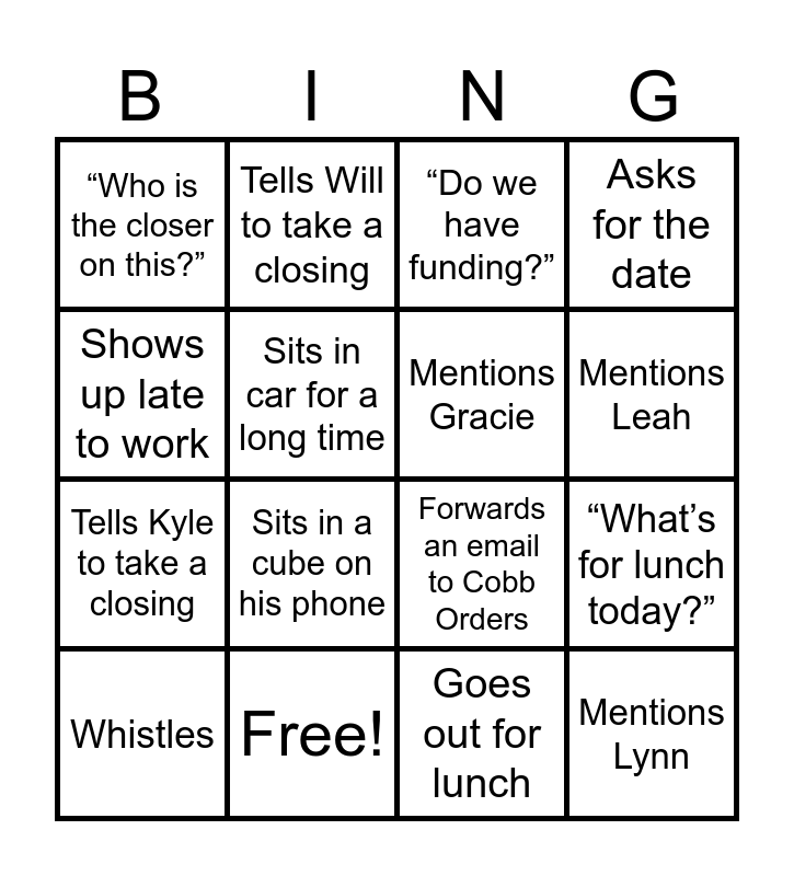 This bingo card has 16 words: Free!, “What’s for lunch today?”, “Do we have funding?”, “Who is the closer on this?”, Tells Kyle to take a closing, Tells Will to take a closing, Forwards an email to Cobb Orders, Goes out for lunch, Shows up late to work, Sits in car for a long time, Whistles, Asks for the date, Sits in a cube on his phone, Mentions Leah, Mentions Gracie and Mentions Lynn.