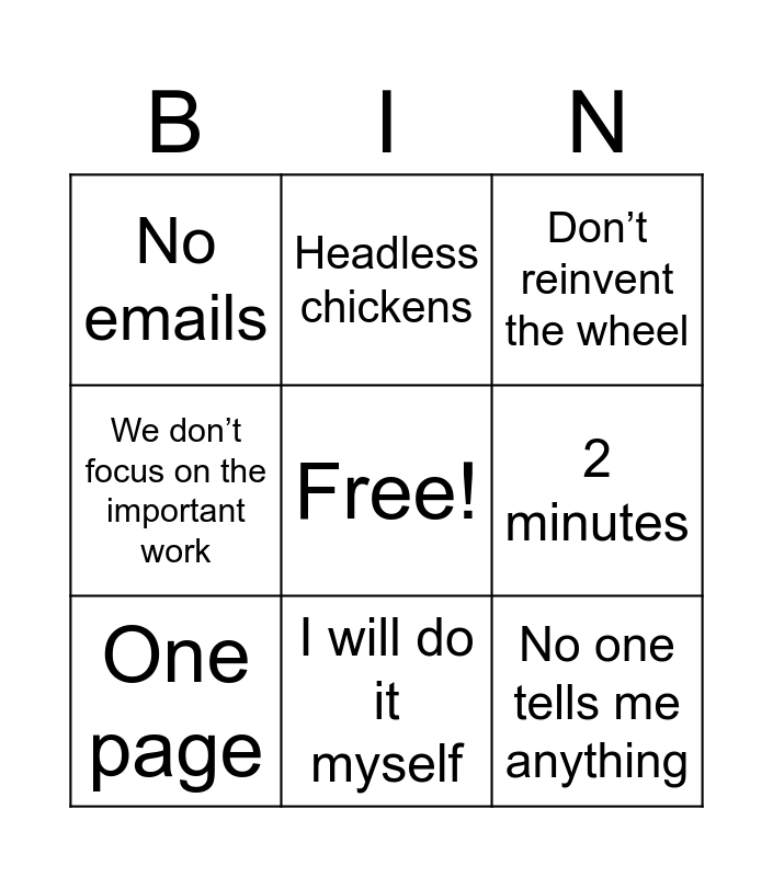 This bingo card has a free space and 8 words: 2 minutes, Don’t reinvent the wheel, Headless chickens, One page, No emails, No one tells me anything, We don’t focus on the important work and I will do it myself.