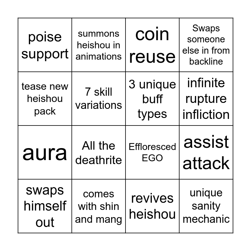 This bingo card has 16 words: comes with shin and mang, assist attack, coin reuse, poise support, aura, summons heishou in animations, Effloresced EGO, revives heishou, tease new heishou pack, 7 skill variations, swaps himself out, Swaps someone else in from backline, All the deathrite, infinite rupture infliction, 3 unique buff types and unique sanity mechanic.