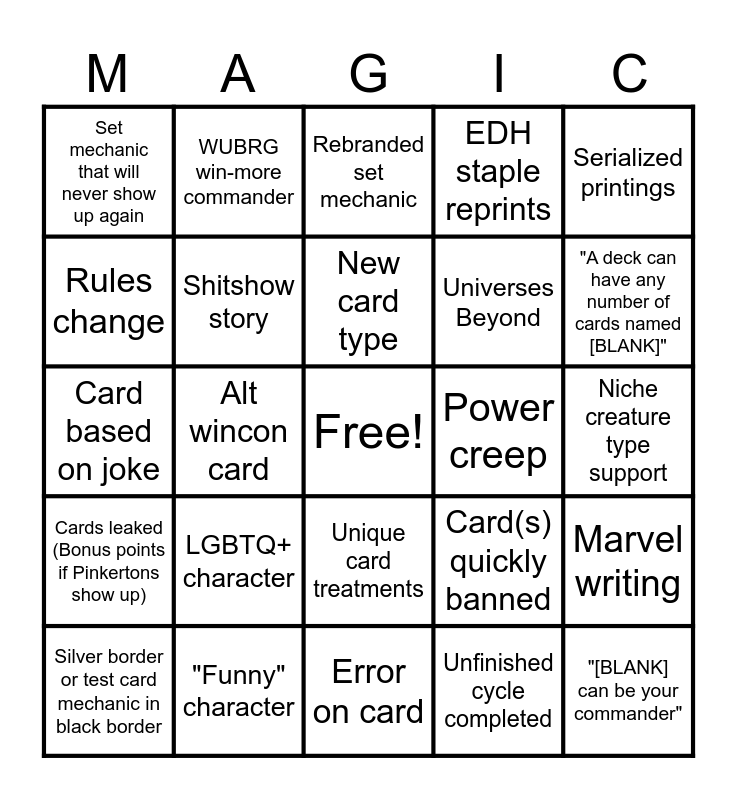 This bingo card has a free space and 24 words: LGBTQ+ character, "Funny" character, New card type, Silver border or test card mechanic in black border, Serialized printings, Set mechanic that will never show up again, Rules change, WUBRG win-more commander, Power creep, Unique card treatments, Universes Beyond, Card based on joke, Card(s) quickly banned, Marvel writing, Shitshow story, Unfinished cycle completed, Niche creature type support, Rebranded set mechanic, "A deck can have any number of cards named [BLANK]", Alt wincon card, "[BLANK] can be your commander", Cards leaked (Bonus points if Pinkertons show up), EDH staple reprints and Error on card.