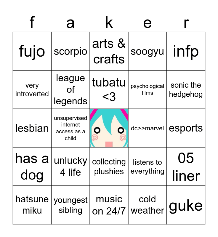 This bingo card has a free space and 24 words: hatsune miku, unlucky 4 life, tubatu <3, cold weather, infp, fujo, scorpio, arts & crafts, dc>>marvel, esports, lesbian, league of legends, listens to everything, 05 liner, very introverted, youngest sibling, music on 24/7, soogyu, sonic the hedgehog, has a dog, unsupervised internet access as a child, collecting plushies, psychological films and guke.
