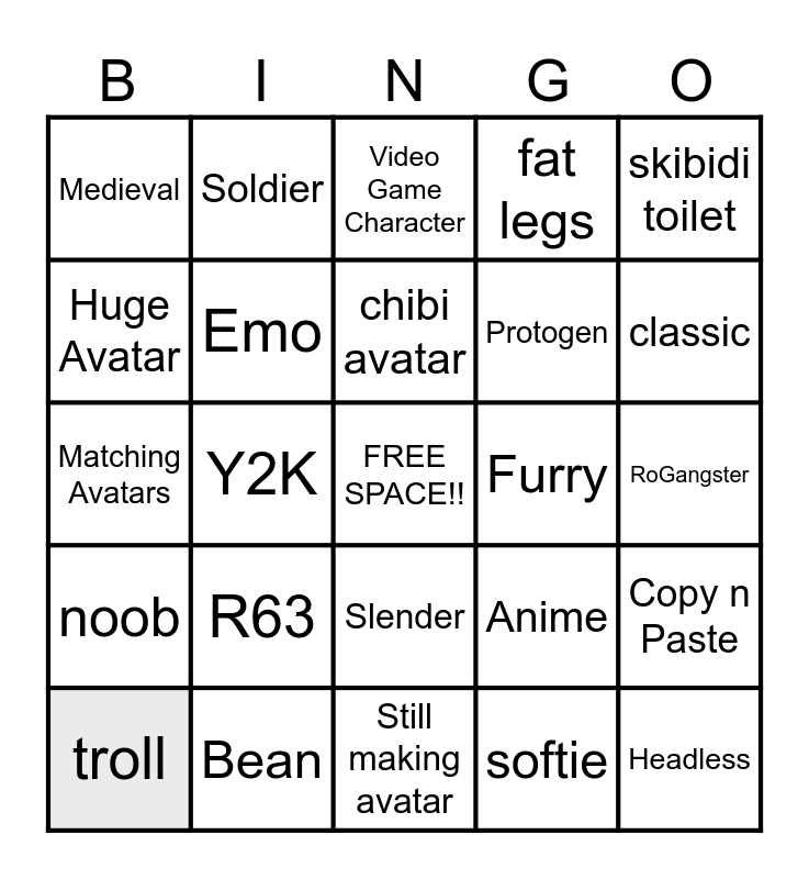 This bingo card has a free space and 24 words: troll, R63, chibi avatar, softie, skibidi toilet, Medieval, Soldier, Video Game Character, Furry, RoGangster, Matching Avatars, Emo, Anime, Copy n Paste, Huge Avatar, Bean, Still making avatar, fat legs, classic, noob, Y2K, Slender, Protogen and Headless.