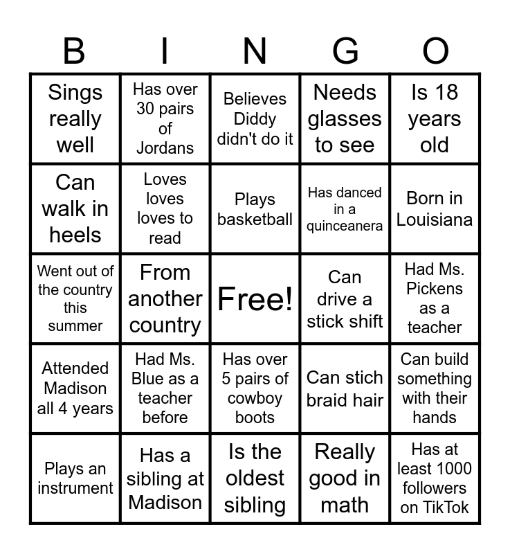 This bingo card has a free space and 24 words: Had Ms. Blue as a teacher before, Has a sibling at Madison, Plays basketball, Plays an instrument, Is 18 years old, Sings really well, Can walk in heels, Has over 30 pairs of Jordans, Can drive a stick shift, Has over 5 pairs of cowboy boots, Has danced in a quinceanera, Went out of the country this summer, Can stich braid hair, Can build something with their hands, Loves loves loves to read, Really good in math, Had Ms. Pickens as a teacher, Believes Diddy didn't do it, Born in Louisiana, From another country, Has at least 1000 followers on TikTok, Attended Madison all 4 years, Needs glasses to see and Is the oldest sibling.