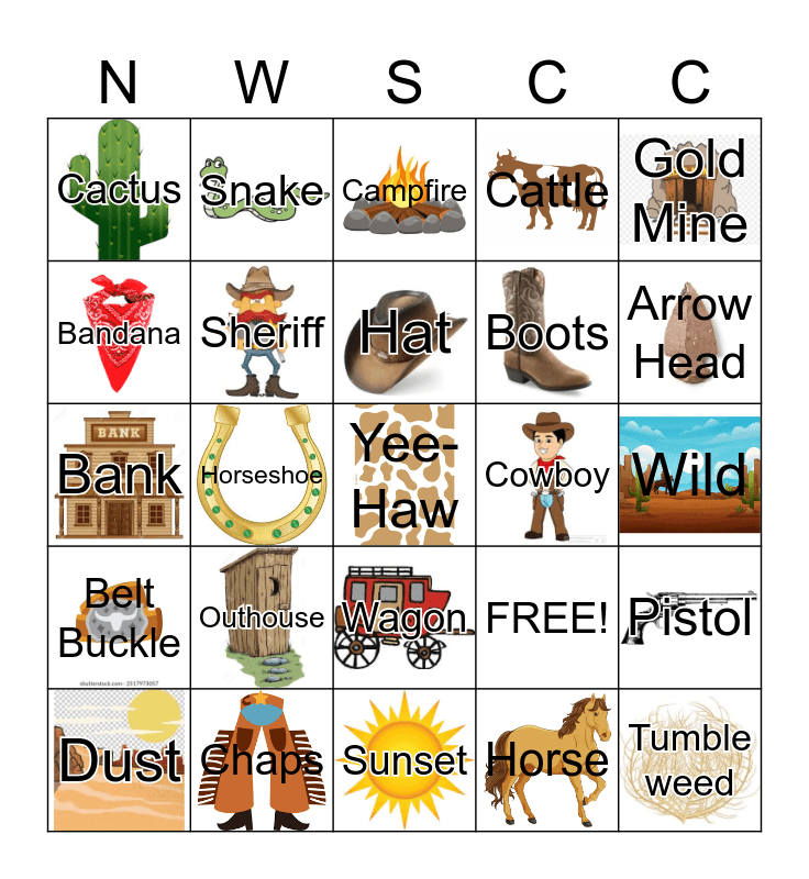 This bingo card has 24 images and 25 words: Outhouse, Sunset, Hat, Dust, Gold Mine, Cactus, Bandana, Snake, Cowboy, Wagon, Boots, Bank, FREE!, Pistol, Sheriff, Tumble weed, Wild, Campfire, Arrow Head, Horseshoe, Yee-Haw, Chaps, Belt Buckle, Cattle and Horse.