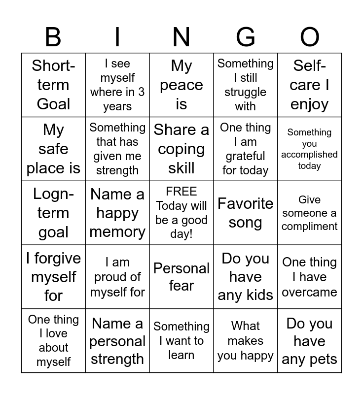 This bingo card has a free space and 24 words: I am proud of myself for, Name a personal strength, Share a coping skill, One thing I love about myself, Self-care I enjoy, Short-term Goal, My safe place is, I see myself where in 3 years, Favorite song, Personal fear, One thing I am grateful for today, Logn-term goal, Do you have any kids, One thing I have overcame, Something that has given me strength, What makes you happy, Give someone a compliment, My peace is, Something you accomplished today, Name a happy memory, Do you have any pets, I forgive myself for, Something I still struggle with and Something I want to learn.