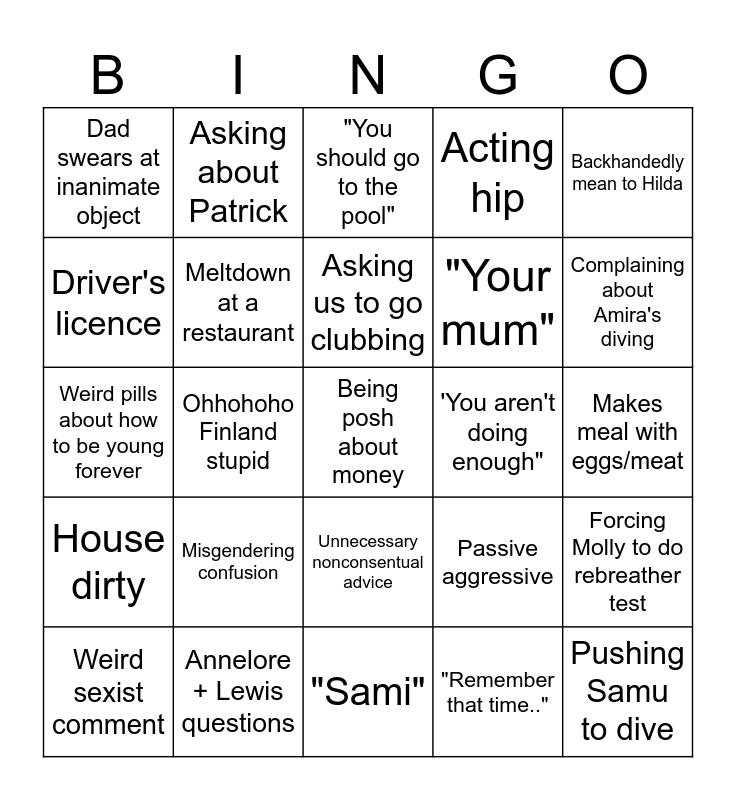 This bingo card has a free space and 24 words: Misgendering confusion, Annelore + Lewis questions, Asking us to go clubbing, Weird sexist comment, Backhandedly mean to Hilda, Dad swears at inanimate object, Driver's licence, Asking about Patrick, 'You aren't doing enough", Unnecessary nonconsentual advice, "Your mum", Weird pills about how to be young forever, Passive aggressive, Forcing Molly to do rebreather test, Meltdown at a restaurant, "Remember that time..", Makes meal with eggs/meat, "You should go to the pool", Complaining about Amira's diving, Ohhohoho Finland stupid, Pushing Samu to dive, House dirty, Acting hip and "Sami".