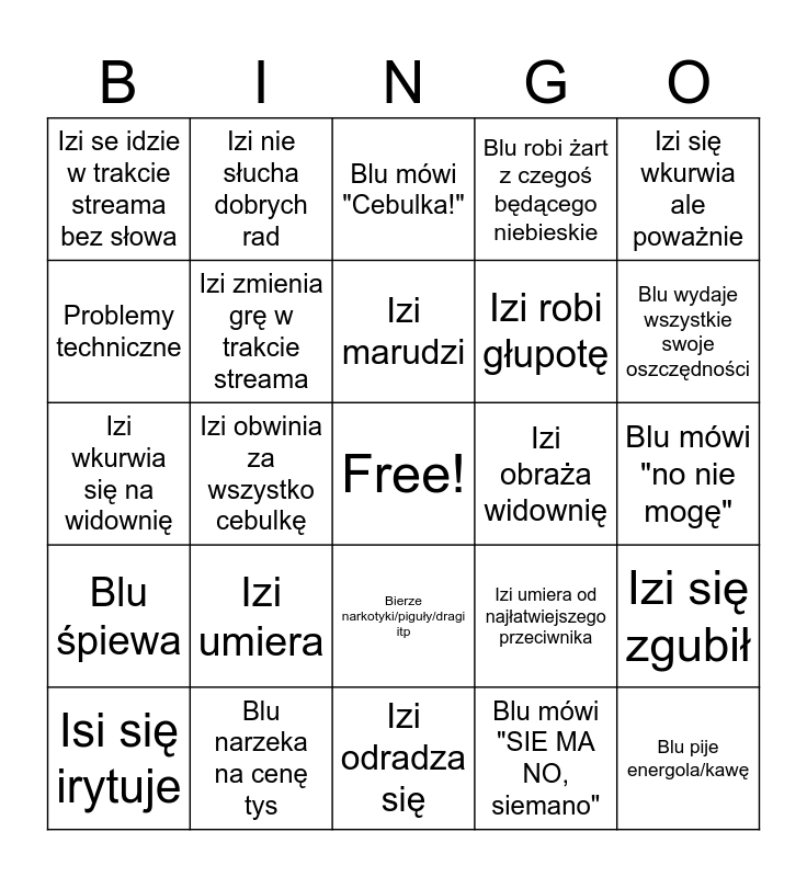 This bingo card has a free space and 25 words: Izi umiera, Izi odradza się, Izi marudzi, Isi się irytuje, Izi się wkurwia ale poważnie, Izi se idzie w trakcie streama bez słowa, Problemy techniczne, Izi nie słucha dobrych rad, Izi obraża widownię, Bierze narkotyki/piguły/dragi itp, Izi robi głupotę, Izi wkurwia się na widownię, Izi umiera od najłatwiejszego przeciwnika, Izi się zgubił, Izi zmienia grę w trakcie streama, Blu mówi "kur zapiął", Blu mówi "no nie mogę", Blu mówi "Cebulka!", Blu wydaje wszystkie swoje oszczędności, Izi obwinia za wszystko cebulkę, Blu pije energola/kawę, Blu narzeka na cenę tys, Blu śpiewa, Blu robi żart z czegoś będącego niebieskie and Blu mówi "SIE MA NO, siemano".