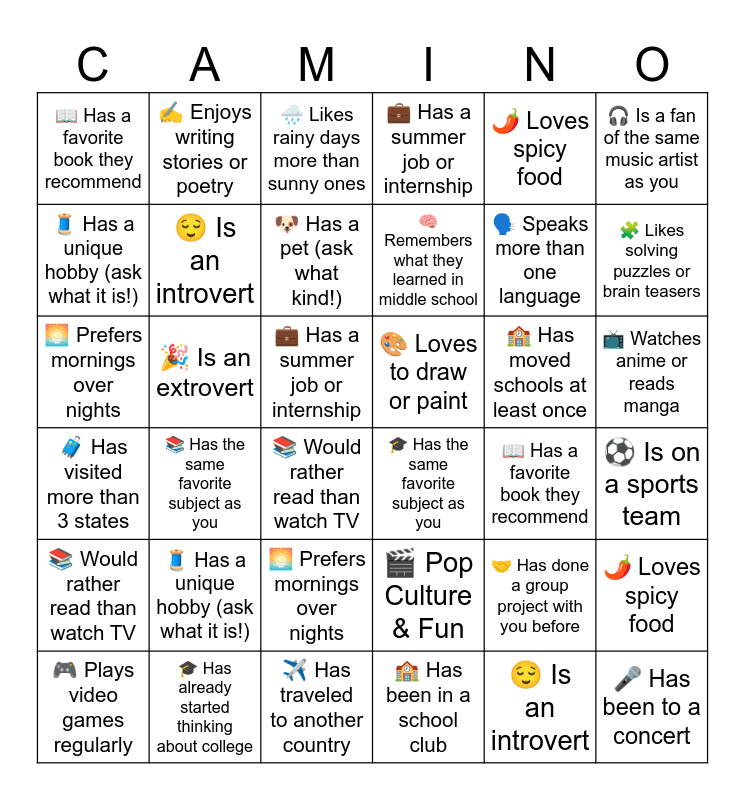 This bingo card has 60 words: Free!, ๐ Has the same favorite subject as you, ๐ธ Plays a musical instrument, ๐จ Loves to draw or paint, โฝ Is on a sports team, โ๏ธ Enjoys writing stories or poetry, ๐งต Has a unique hobby (ask what it is!), โ๏ธ Has traveled to another country, ๐ถ Has a pet (ask what kind!), ๐ซ Has moved schools at least once, ๐ผ Has a summer job or internship, ๐ฅ Has seen the same movie more than 3 times, ๐ง Is a fan of the same music artist as you, ๐ฎ Plays video games regularly, ๐บ Watches anime or reads manga, ๐ Has a favorite book they recommend, ๐ Prefers mornings over nights, ๐ถ๏ธ Loves spicy food, ๐ฃ๏ธ Speaks more than one language, ๐ Is an introvert, ๐ Is an extrovert, ๐ง๏ธ Likes rainy days more than sunny ones, ๐ Would rather read than watch TV, ๐ Has the same favorite subject as you, ๐ฉโ๐ซ Has a favorite teacher theyโve had since 9th grade, ๐ Has already started thinking about college, ๐ค Has done a group project with you before, ๐ Enjoys taking notes in class, ๐ง Remembers what they learned in middle school, ๐ซ Has been in a school club, ๐จ Hobbies & Interests, ๐ธ Plays a musical instrument, ๐จ Loves to draw or paint, โฝ Is on a sports team, โ๏ธ Enjoys writing stories or poetry, ๐งต Has a unique hobby (ask what it is!), ๐น๏ธ Builds or codes things for fun, ๐งฉ Likes solving puzzles or brain teasers, โ๏ธ Has traveled to another country, ๐ฃ๏ธ Speaks more than one language, ๐ถ Has a pet (ask what kind!), ๐ซ Has moved schools at least once, ๐ผ Has a summer job or internship, ๐๏ธ Has gone camping, ๐งณ Has visited more than 3 states, ๐ฌ Pop Culture & Fun, ๐ฅ Has seen the same movie more than 3 times, ๐ง Is a fan of the same music artist as you, ๐ฎ Plays video games regularly, ๐บ Watches anime or reads manga, ๐ Has a favorite book they recommend, ๐บ Knows a TikTok dance, ๐ค Has been to a concert, ๐ Prefers mornings over nights, ๐ถ๏ธ Loves spicy food, ๐ Is an introvert, ๐Is an extrovert, ๐ง๏ธ Likes rainy days more than sunny ones, ๐ Would rather read than watch TV and ๐ Has a favorite pizza topping.