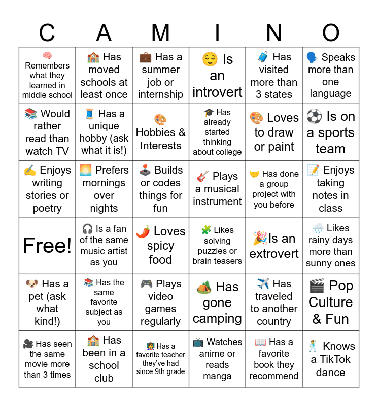 This bingo card has 38 words: Free!, ๐ Has the same favorite subject as you, ๐ฉโ๐ซ Has a favorite teacher theyโve had since 9th grade, ๐ Has already started thinking about college, ๐ค Has done a group project with you before, ๐ Enjoys taking notes in class, ๐ง Remembers what they learned in middle school, ๐ซ Has been in a school club, ๐จ Hobbies & Interests, ๐ธ Plays a musical instrument, ๐จ Loves to draw or paint, โฝ Is on a sports team, โ๏ธ Enjoys writing stories or poetry, ๐งต Has a unique hobby (ask what it is!), ๐น๏ธ Builds or codes things for fun, ๐งฉ Likes solving puzzles or brain teasers, โ๏ธ Has traveled to another country, ๐ฃ๏ธ Speaks more than one language, ๐ถ Has a pet (ask what kind!), ๐ซ Has moved schools at least once, ๐ผ Has a summer job or internship, ๐๏ธ Has gone camping, ๐งณ Has visited more than 3 states, ๐ฌ Pop Culture & Fun, ๐ฅ Has seen the same movie more than 3 times, ๐ง Is a fan of the same music artist as you, ๐ฎ Plays video games regularly, ๐บ Watches anime or reads manga, ๐ Has a favorite book they recommend, ๐บ Knows a TikTok dance, ๐ค Has been to a concert, ๐ Prefers mornings over nights, ๐ถ๏ธ Loves spicy food, ๐ Is an introvert, ๐Is an extrovert, ๐ง๏ธ Likes rainy days more than sunny ones, ๐ Would rather read than watch TV and ๐ Has a favorite pizza topping.