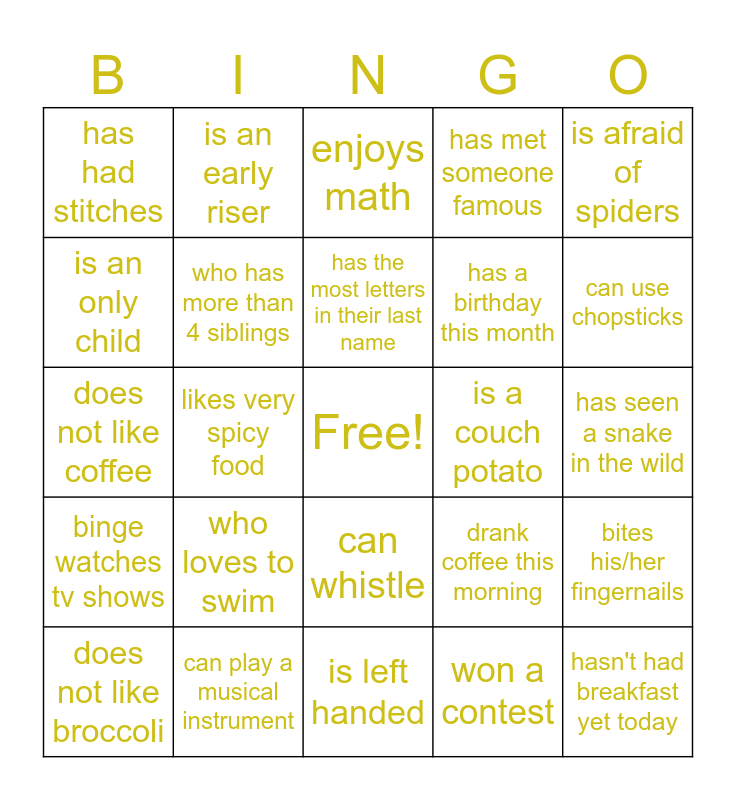 This bingo card has a free space and 24 words: who loves to swim, can play a musical instrument, has the most letters in their last name, does not like broccoli, is afraid of spiders, has had stitches, is an only child, is an early riser, is a couch potato, can whistle, has a birthday this month, does not like coffee, drank coffee this morning, bites his/her fingernails, who has more than 4 siblings, won a contest, has seen a snake in the wild, enjoys math, can use chopsticks, likes very spicy food, hasn't had breakfast yet today, binge watches tv shows, has met someone famous and is left handed.