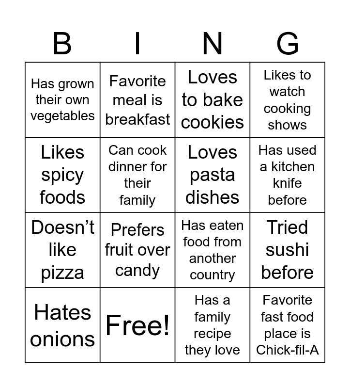 This bingo card has 16 words: Free!, Tried sushi before, Loves to bake cookies, Has grown their own vegetables, Doesn’t like pizza, Favorite meal is breakfast, Has eaten food from another country, Has a family recipe they love, Likes spicy foods, Can cook dinner for their family, Hates onions, Likes to watch cooking shows, Prefers fruit over candy, Has used a kitchen knife before, Loves pasta dishes and Favorite fast food place is Chick-fil-A.