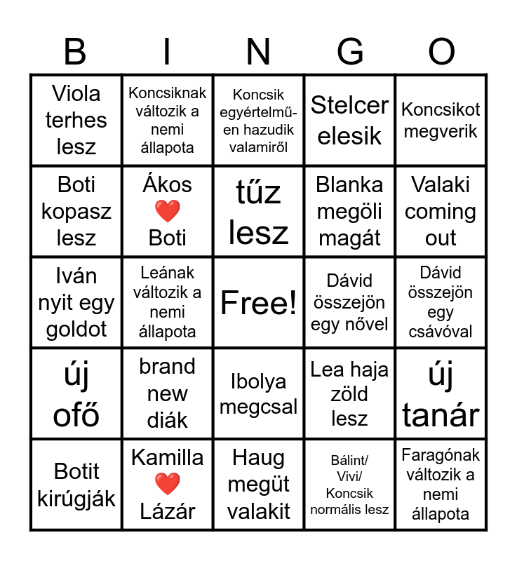 This bingo card has a free space and 24 words: brand new diák, Kamilla ❤️ Lázár, tűz lesz, Botit kirúgják, Koncsikot megverik, Viola terhes lesz, Boti kopasz lesz, Koncsiknak változik a nemi állapota, Dávid összejön egy nővel, Ibolya megcsal, Blanka megöli magát, Iván nyit egy goldot, Lea haja zöld lesz, új tanár, Ákos ❤️ Boti, Bálint/ Vivi/ Koncsik normális lesz, Dávid összejön egy csávóval, Koncsik egyértelmű-en hazudik valamiről, Valaki coming out, Leának változik a nemi állapota, Faragónak változik a nemi állapota, új ofő, Stelcer elesik and Haug megüt valakit.