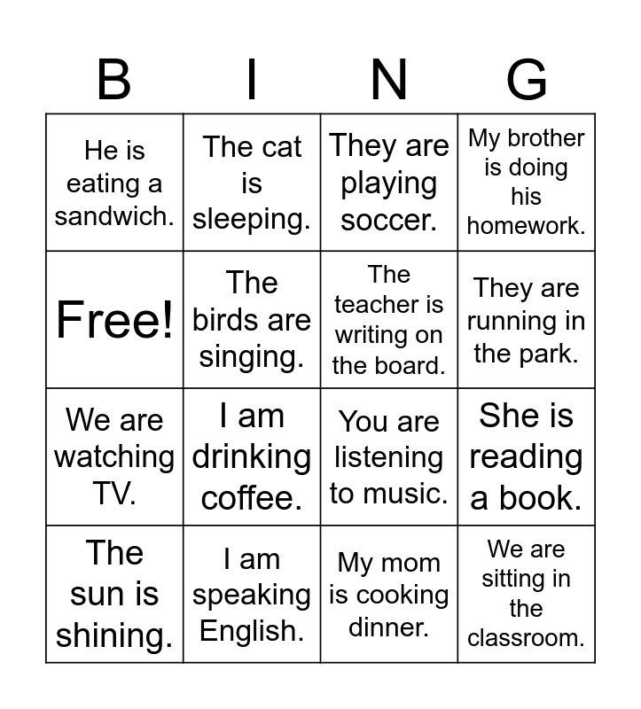 This bingo card has 16 words: I am speaking English., She is reading a book., They are playing soccer., He is eating a sandwich., We are watching TV., The cat is sleeping., You are listening to music., My mom is cooking dinner., Free!, The birds are singing., The sun is shining., My brother is doing his homework., I am drinking coffee., They are running in the park., The teacher is writing on the board. and We are sitting in the classroom..