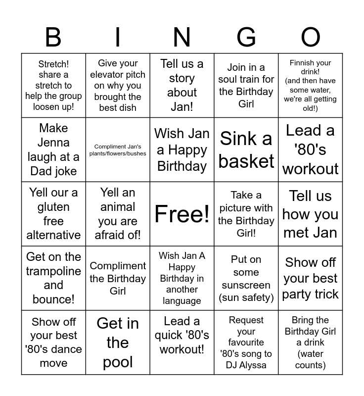 This bingo card has a free space and 24 words: Compliment the Birthday Girl, Get in the pool, Wish Jan a Happy Birthday, Show off your best '80's dance move, Finnish your drink! (and then have some water, we're all getting old!), Stretch! share a stretch to help the group loosen up!, Make Jenna laugh at a Dad joke, Give your elevator pitch on why you brought the best dish, Take a picture with the Birthday Girl!, Wish Jan A Happy Birthday in another language, Sink a basket, Yell our a gluten free alternative, Put on some sunscreen (sun safety), Show off your best party trick, Compliment Jan's plants/flowers/bushes, Request your favourite '80's song to DJ Alyssa, Tell us how you met Jan, Tell us a story about Jan!, Lead a '80's workout, Yell an animal you are afraid of!, Bring the Birthday Girl a drink (water counts), Get on the trampoline and bounce!, Join in a soul train for the Birthday Girl and Lead a quick '80's workout!.
