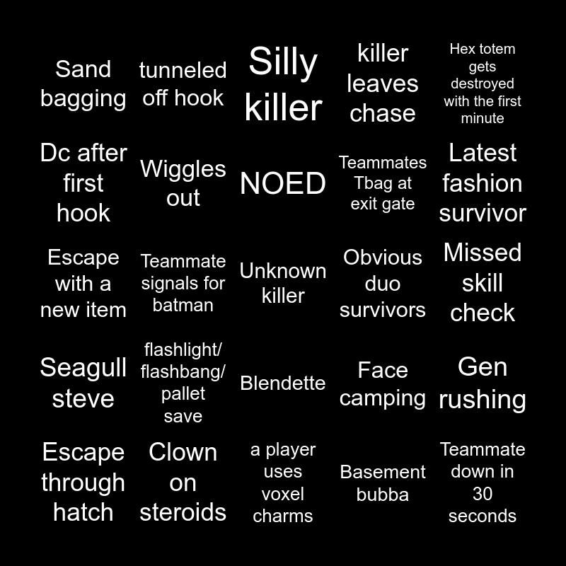 This bingo card has 25 words: flashlight/ flashbang/ pallet save, a player uses voxel charms, NOED, Escape through hatch, Hex totem gets destroyed with the first minute, Sand bagging, Dc after first hook, tunneled off hook, Obvious duo survivors, Blendette, Teammates Tbag at exit gate, Escape with a new item, Face camping, Gen rushing, Wiggles out, Teammate down in 30 seconds, Missed skill check, Silly killer, Latest fashion survivor, Teammate signals for batman, Unknown killer, Clown on steroids, Seagull steve, killer leaves chase and Basement bubba.