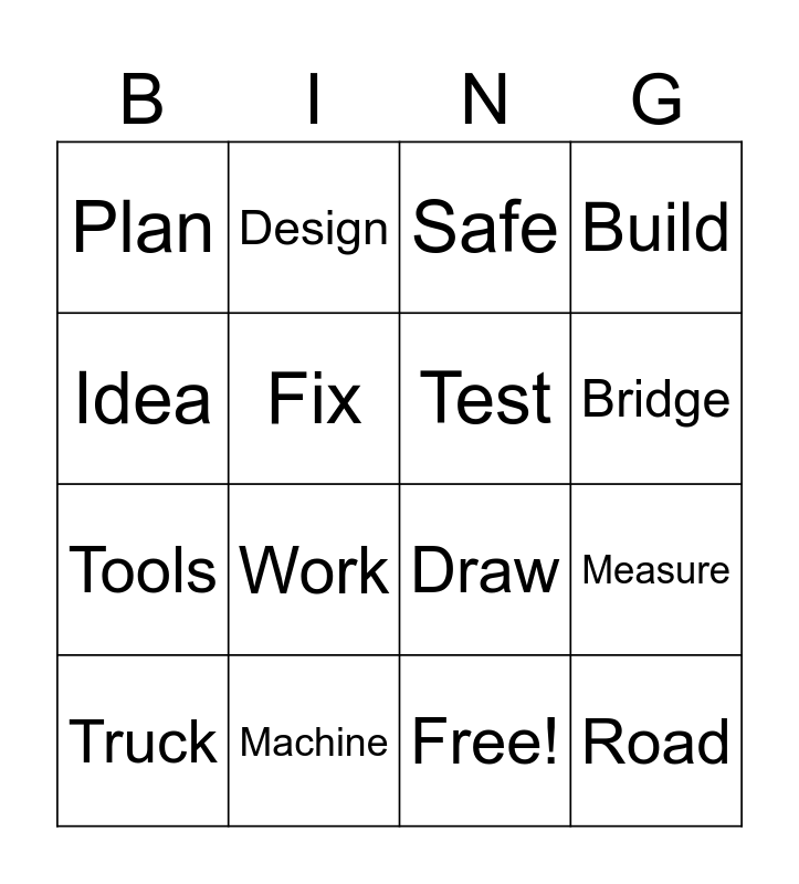 This bingo card has 17 words: Free!, Truck, Safe, Plan, Work, Build, Measure, Test, Bridge, Fix, Machine, Draw, Idea, Design, Tools, Helmet and Road.