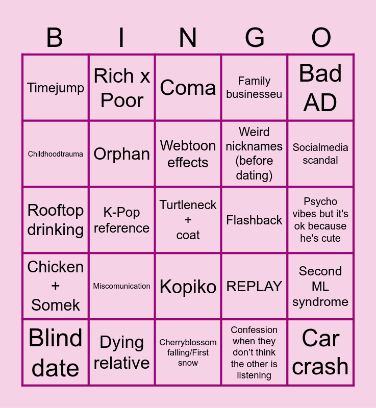 This bingo card has a free space and 51 words: Amnesia, Car crash, Bad english actors, Cherryblossom falling/First snow, Miscomunication, EX Causing problems, Rich x Poor, Secret relationship, Childhoodtrauma, Abroad, Orphan, Family businesseu, Second ML syndrome, REPLAY, Seceret identities, Slowmotion, Webtoon effects, Flashback, Bullying, Bad AD, K-Pop reference, Confession when they don’t think the other is listening, Timejump, Weird nicknames (before dating), Stupid FL, OST ft. famous K-pop artist, Socialmedia scandal, KDrama magic, Blind date, Coma, Arranged marriage, Fixing hair, Playing basketball, A grandma owning a shop/cart, Box folding (Poor people behavior), Dying relative, Relative taking care of ML, Typical FL/ML BFF, Slip up, Pop couture reference, Psycho vibes but it's ok because he's cute, Chicken + Somek, Piggyback, Goofy sound effect, Rooftop apt, Namsan tower, Rooftop drinking, Falling on top of each other (almost kissing), Fake couple, Kopiko and Loan shark.