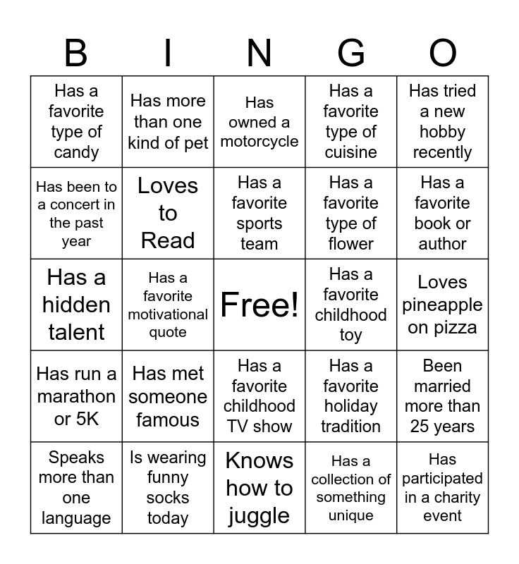 This bingo card has a free space and 29 words: Speaks more than one language, Has been skydiving or bungee jumping, Has a favorite motivational quote, Has binge-watched an entire series in one weekend, Has a favorite type of candy, Has owned a motorcycle, Loves to Read, Has met someone famous, Has a favorite childhood toy, Is wearing funny socks today, Loves pineapple on pizza, Has participated in a charity event, Knows how to juggle, Has a collection of something unique, Has a favorite book or author, Can play a musical instrument, Has a favorite childhood TV show, Has run a marathon or 5K, Has tried a new hobby recently, Has a hidden talent, Has a favorite holiday tradition, Has a coffee addiction, Has a favorite type of flower, Has been to a concert in the past year, Has a favorite type of cuisine, Has more than one kind of pet, Been married more than 25 years, Has a favorite sports team and Has more than one sibling.