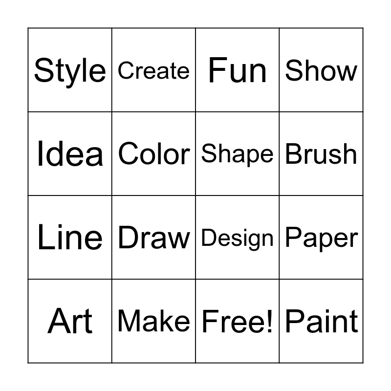 This bingo card has 17 words: Free!, Art, Fun, Style, Draw, Show, Paper, Shape, Brush, Color, Make, Design, Idea, Create, Line, Picture and Paint.