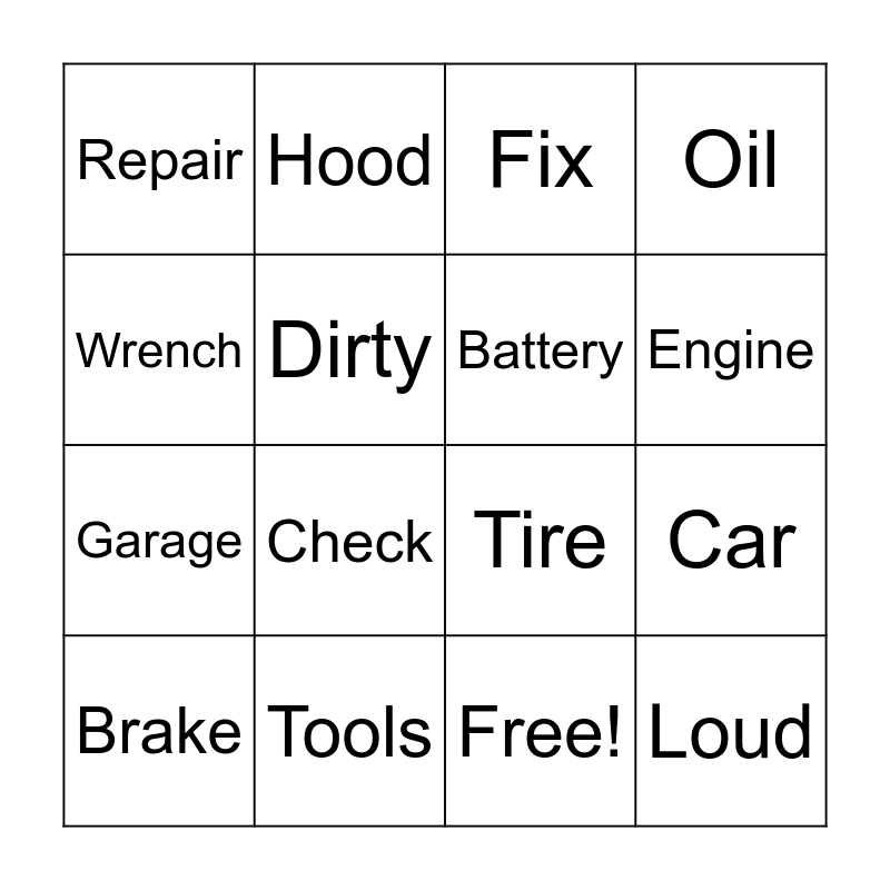 This bingo card has 17 words: Free!, Brake, Fix, Repair, Check, Oil, Car, Battery, Engine, Dirty, Tools, Tire, Wrench, Hood, Garage, Lift and Loud.
