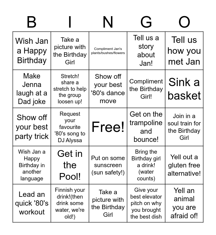This bingo card has a free space and 24 words: Get in the Pool!, Finnish your drink!(then drink some water, we're old!), Show off your best '80's dance move, Lead an quick '80's workout, Tell us how you met Jan, Wish Jan a Happy Birthday, Make Jenna laugh at a Dad joke, Take a picture with the Birthday Girl, Get on the trampoline and bounce!, Put on some sunscreen (sun safety!), Compliment the Birthday Girl!, Show off your best party trick, Bring the Birthday girl a drink!(water counts), Yell out a gluten free alternative!, Stretch! share a stretch to help the group loosen up!, Give your best elevator pitch on why you brought the best dish, Join in a soul train for the Birthday Girl, Compliment Jan's plants/bushes/flowers, Sink a basket, Request your favourite '80's song to DJ Alyssa, Yell an animal you are afraid of!, Wish Jan a Happy Birthday in another language, Tell us a story about Jan! and Take a picture with the Birthday Girl.