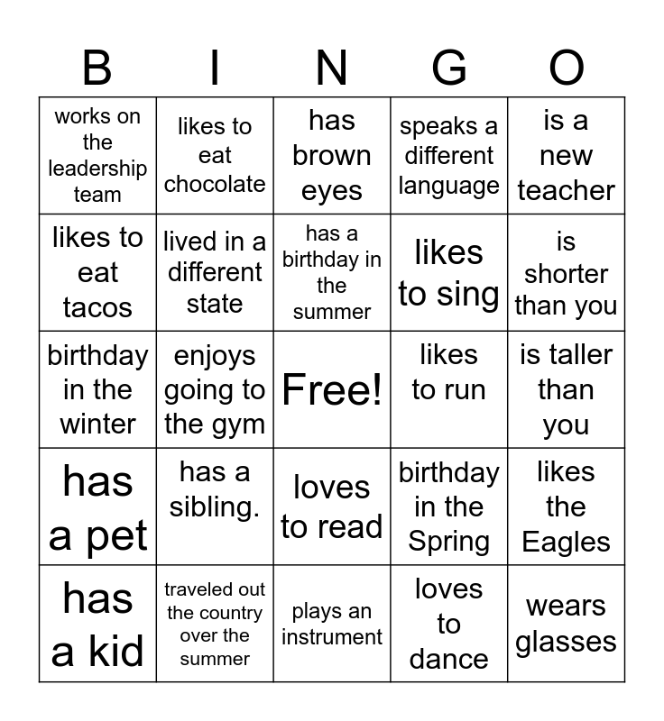 This bingo card has a free space and 24 words: has a sibling., traveled out the country over the summer, has a birthday in the summer, has a kid, is a new teacher, works on the leadership team, likes to eat tacos, likes to eat chocolate, likes to run, loves to read, likes to sing, birthday in the winter, birthday in the Spring, likes the Eagles, lived in a different state, loves to dance, is taller than you, has brown eyes, is shorter than you, enjoys going to the gym, wears glasses, has a pet, speaks a different language and plays an instrument.